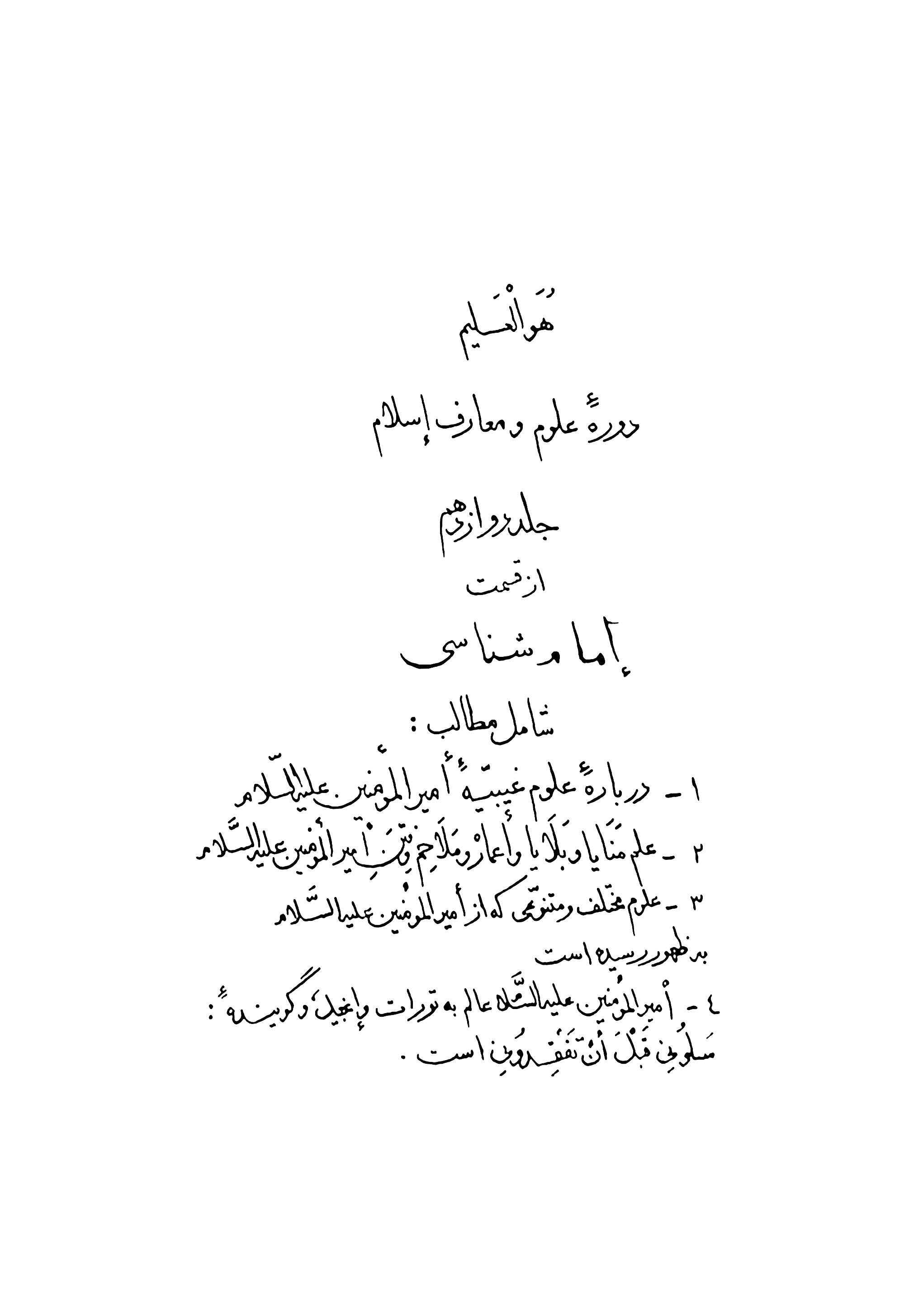 جلد دوازدهم از مجموعۀ «امام شناسی» از آثار نفیسِ علامه آیة‌الله حاج سید محمد‌حسین حسینی طهرانی قدّس الله سرّه بوده که پیرامون «علوم امیرالمؤمنین علیه‌السلام؛ اعم از علوم باطنی و ظاهری، و علم به ادیان مختلف» در قالب بحثهای تفسیری و فقه الحدیث، و ابحاث فلسفی، عرفانی، تاریخی و اجتماعی به رشتۀ تحریر درآمده و به ساحت علم و معرفت تقدیم شده است.  مهم‌ترین مباحث مندرج در این مجلّد:  • علم امام و رسول، عين علم ذات حقّ   • منظور از اختصاص علم غیب به ذات حق  • نمونه‏‌هاى متعدّدى از إخبارات غيبى اميرالمؤمنين عليه‌‏السّلام‏  • جمع‌‏آورى قرآن توسّط آن حضرت‏  • عمَر چون قدرت بر پاسخ نداشت سؤال از معانى و مفاهيم قرآن را منع كرد  • لزوم رجوع به امام در رابطه با قرآن‏  • سبقت اميرالمؤمنين عليه‏‌السّلام بر همگان در جميع علوم  • بازگشت همۀ علوم به آنحضرت  • اميرالمؤمنين عليه‏السّلام عالم به تورات و انجيل  • کلام «سلونى قبل ان تفقدونی»‏ راجع به حقائق و باطن قرآن است؛ نه ظاهر آن‏  • اوج معارف إلهيه در خطبه‏‌هاى توحيدى اميرالمؤمنين عليه‏‌السّلام‏  • توضيح وتفسير توحيد حقّه حقيقيۀ ذات حقّ تعالى‏  • معرفت امام، عالى‏ترين وسيله براى رسيدن به توحيد است‏