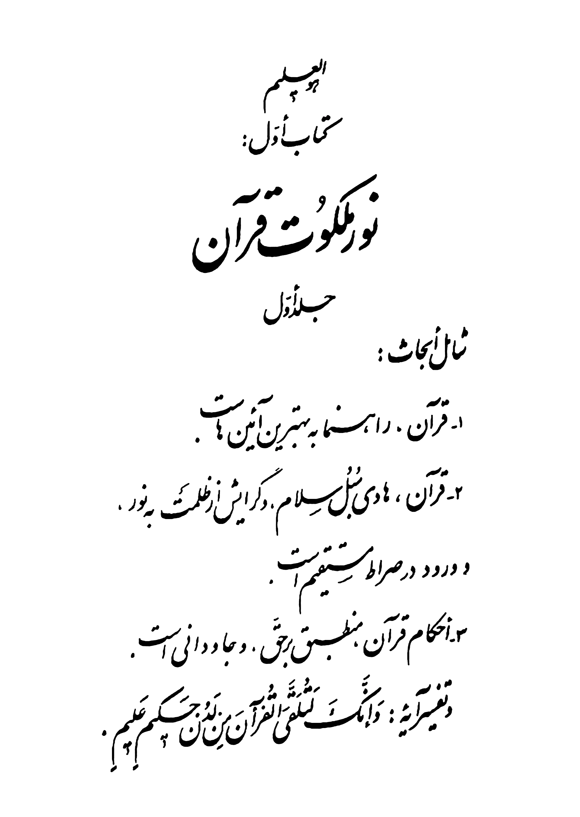 جلد اول مجموعۀ «نور ملکوت قرآن» از آثار ماندگار مرحوم علامه آیة‌الله حاج سید محمدحسین حسینی طهرانی قدّس‌سرّه بوده که پیرامون جنبۀ «حقانیت و هدایتگری قرآن و جامعیتِ احکام آن» با قلمی روان و بیانی سلیس به رشتۀ تحریر درآمده است.  مهم‌ترین مطالب این مجلّد:  • قرآن راهنما به بهترین آیین‌ها  • شواهدی بر بهترین راهنما بودن قرآن  • جاودانگی احکام و معارف قرآن  • حیاتی بودن حکم قصاص در قرآن  • بررسی نظریه همدوشی زنان با مردان در جامعه  • امام معصوم، وجود خارجی قرآن  • عینیت نفس ملکوتی امام معصوم با قرآن  • احترام به والدین بر اساس معارف قرآن  • حرمت تحدید نسل بر اساس معارف قرآن  • کیفیت نزول وحی توسط خداوند و ملائکه  • معجزات پیامبران ، ناشی از جمعیت نفس آنها  • اصالت قرآن بخاطر مبتنی بودن بر فطرت است  • علت ذکر داستانها در قرآن، وجود مشابه آن در نفوس همۀ مردم است