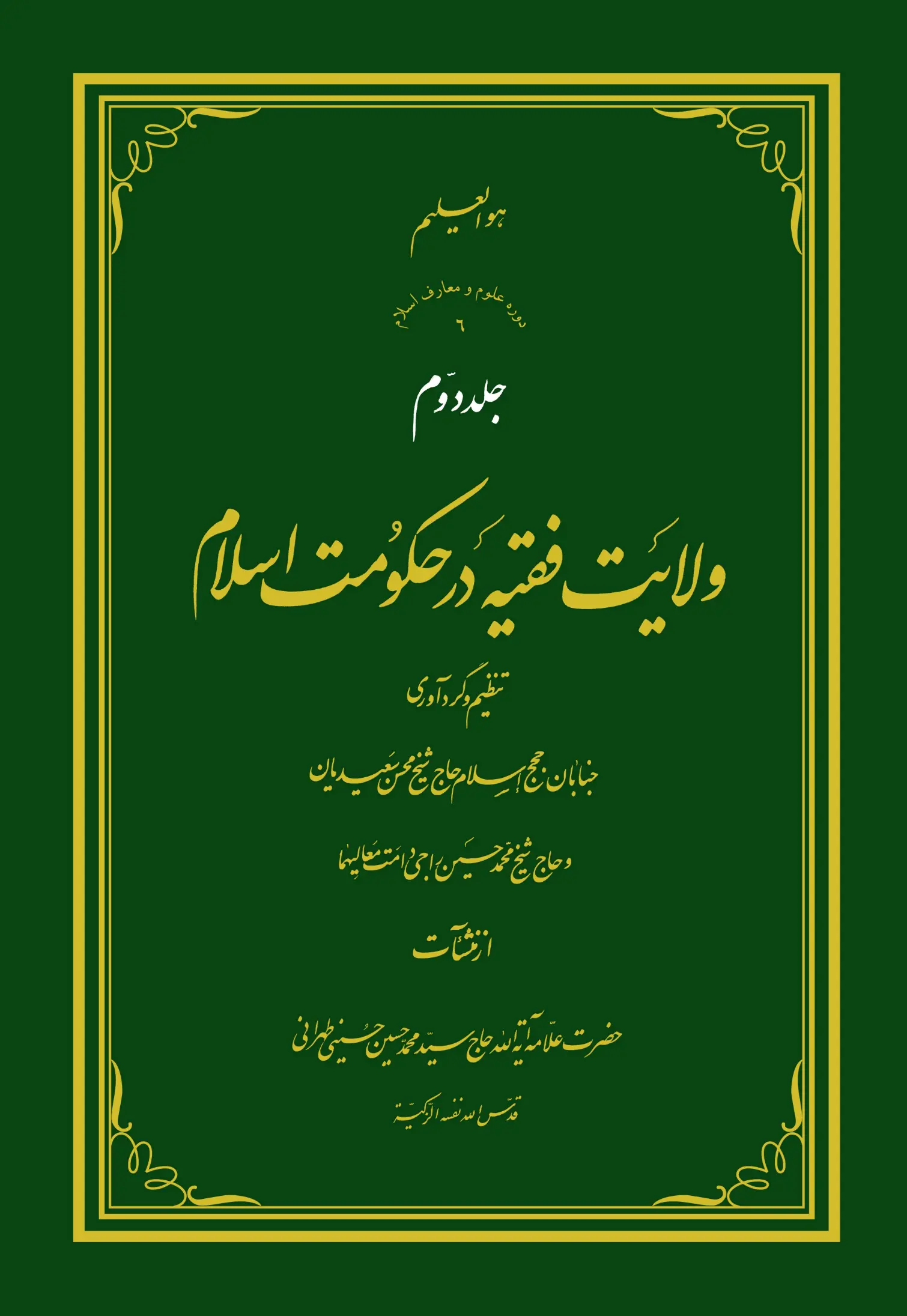 جلد دوم از مجموعۀ «ولایت فقیه در حکومت اسلام»  از آثار برجستۀ حضرت علامه آیة‌الله حاج سید محمد‌حسین حسینی طهرانی قدّس سرّه بوده که پیرامون «ادلۀ ولایت فقیه و سعۀ دلالت آنها» با بیانی سلیس و شواهدی متقن، به رشتۀ تحریر درآمده است.   اهمّ مطالب مندرج در این مجلّد:  • در ولایت فقیه باید علم ظاهر و علم باطن با هم جمع باشد  • بحثی دربارۀ مطلق و مقیّد و کیفیت أخذ به اطلاق   • شناخت علمای سوء از راه ادراک وجدانی و فقه قلبی   • حرمت تقلید در صورت مشاهدۀ فسق ظاهر از مرجع تقلید   • بهترینِ خلق خدا بعد از انبیاء، علماء هستند در صورتی که صالح باشند  • برای مرجعیت، ملکه‌ای بالاتر از عدالت لازم است  • بحثی در عدم صحتِ استصحاب عدالت فقیه، وقتی به مرجعیت می‌رسد  • رجوع جاهل به عالم از جهت فطرت، عقل و شرع  • هنگام دسترسی به اعلم، رجوع به عالم، خلاف است  • دلیل قطعیِ عقلی بر لزوم تشکیل حکومت  • میزان اعلمیت فقیه، اعلمیت به کتاب‌الله است  • هر خبری که خلاف علم باشد، قبل از رجوع به سندش مردود است  • برخی دیگر از روایات دالّه بر ولایت فقیه   • بحث پیرامون «تفسیر منسوب به امام حسن عسکری علیه‌السلام»