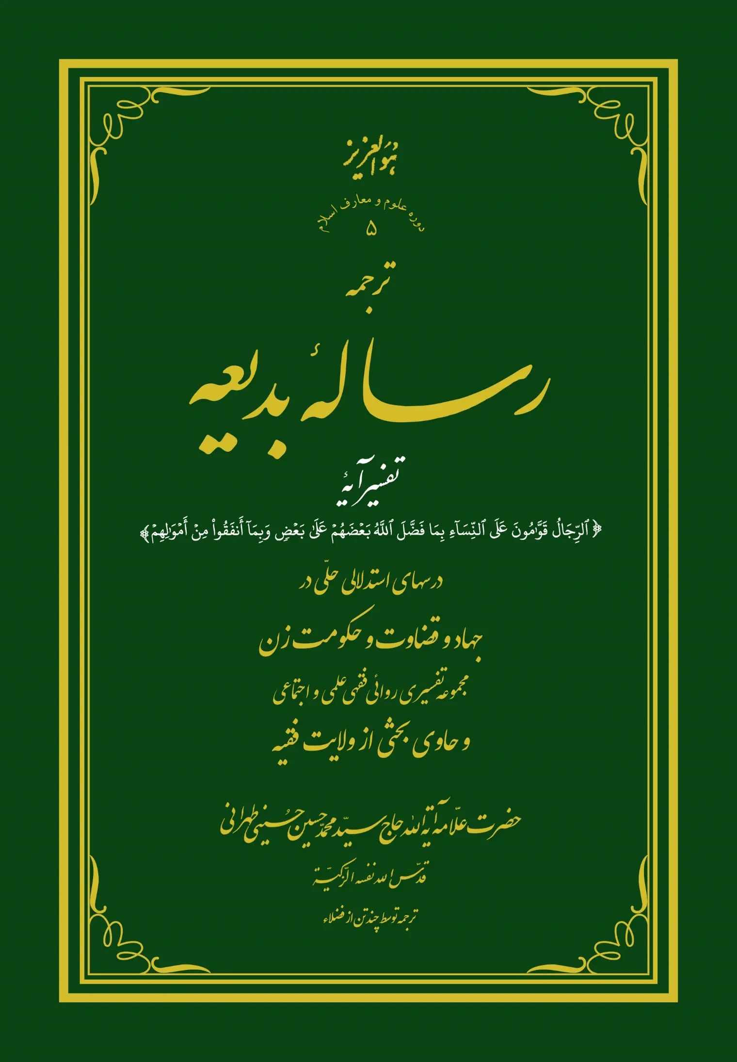 کتاب شریف «رسالۀ بدیعه» از مکتوبات حضرت علامه آیةاللَه حاج سید محمدحسین حسینی طهرانی قدّساللَهسرّه بوده که در این اثر به شرح و تفسير آيه «الرِّجَالُ قَوَّامُونَ عَلَي النِّسَاء» مبادرت ورزیده و در آن درسهائي استدلالي پیرامون بحث از «فلسفۀ حقوق زن و مرد»، «معنای تساوی حقوق زن و مرد»، «مسئله قضاوت و حکومت زن»، «حدود شرکت زنان در جهاد» مطرح شده و شواهدی از آیات و روایات و قرائن عقلائیه پیرامون «عدم جواز تصدّي مناصب حكومتی و قضاوت براي زن» و «عدم جواز ورود زنان به مجلس شوریٰ» بيان شده است. اين مجموعه شامل مطالب تفسيري، روائي، فقهي، علمي و اجتماعي بوده و در آنْ بهمناسبت از ولايت فقيه نيز بحث شده است. اين كتاب كه بهزبان عربي تأليف شده بود، نظر به اينكه موضوع آن در نوع خود بديع و مبيِّن اشكالات و توهّمات در باب جهاد و قضاوت و حكومت زن ميباشد ، توسّط چند تن از فضلاء براي استفاده عموم به فارسي ترجمه گرديد. اهمّ مباحث مندرج در این اثر: • اختلاف قوای ظاهری و باطنی زن و مرد • ادلۀ شرعی و فقهی پیرامون موقعیت زن در زمینه جهاد، قضاوت و حکومت • دلالت اجماع و سیرۀ مسلمین، بر عدم جواز مناصب حکومت و قضاوت برای زن • بحث از ولایت بهمناسبتِ بحث از حکومت و قضاوت برای زن • روایات داله بر عدم تصدی مناصب حکومت و قضاوت برای زن • ادلۀ ثبوت ولایت فقیه